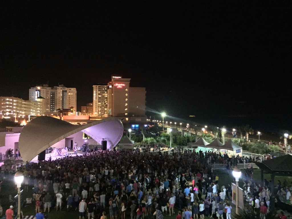 VIRGINIA BEACH, Va. (Thursday, Aug.18, 2016) — With 75mph wind gusts ripping the light truss from the lip of the shed at Neptune Park’s 31st Street Stage in Virginia Beach Wednesday night, it appeared ACM-winning band Old Dominion’s return to their namesake and home state would be rescheduled or at least postponed to a later date due to damages, but Old Dominion — band and crew — proved to be a force of nature themselves. Taking the stage only 90 minutes behind schedule after resetting and securing the stage, Old Dominion members Matthew Ramsey, Brad Tursi, Trevor Rosen, Geoff Sprung and Whitt Sellers welcomed the droves of fans lining the tousled bike railing into the park for a free stripped performance that included their two-week No. 1 “Break Up With Him,” “Snapback” and current single “Song For Another Time” from their debut album Meat And Candy, along with several of the hits they’ve written for other artists.