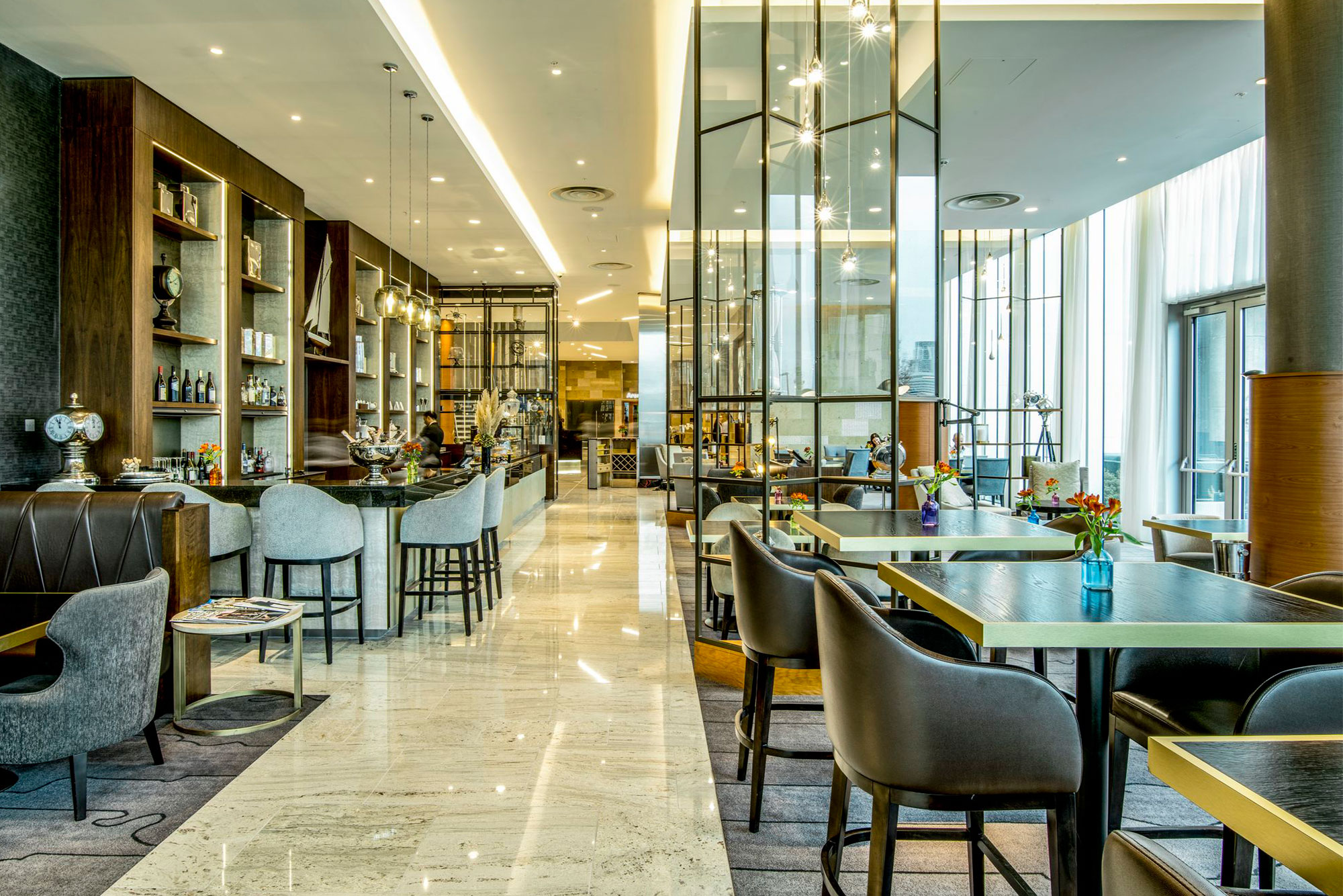 Right at the top on the 18th floor has wonderful views, especially at night and is a great place to socialise. It also has a selection of light bite snacks. If you are a smoker, there is also a smoking area. The bar has floor to ceiling windows for amazing views – even the bathrooms do which, by the way, are immaculate with luxurious soap gel and moisturiser.