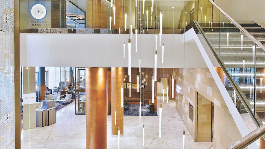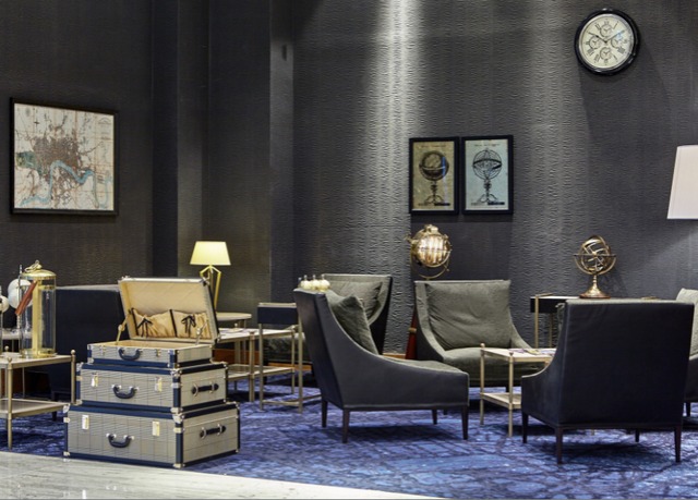 There is a Concierge, newspapers and tourist information in a stacked trio of old style suitcases and welcome seating areas for guests to relax or have a conversation with family or friends.