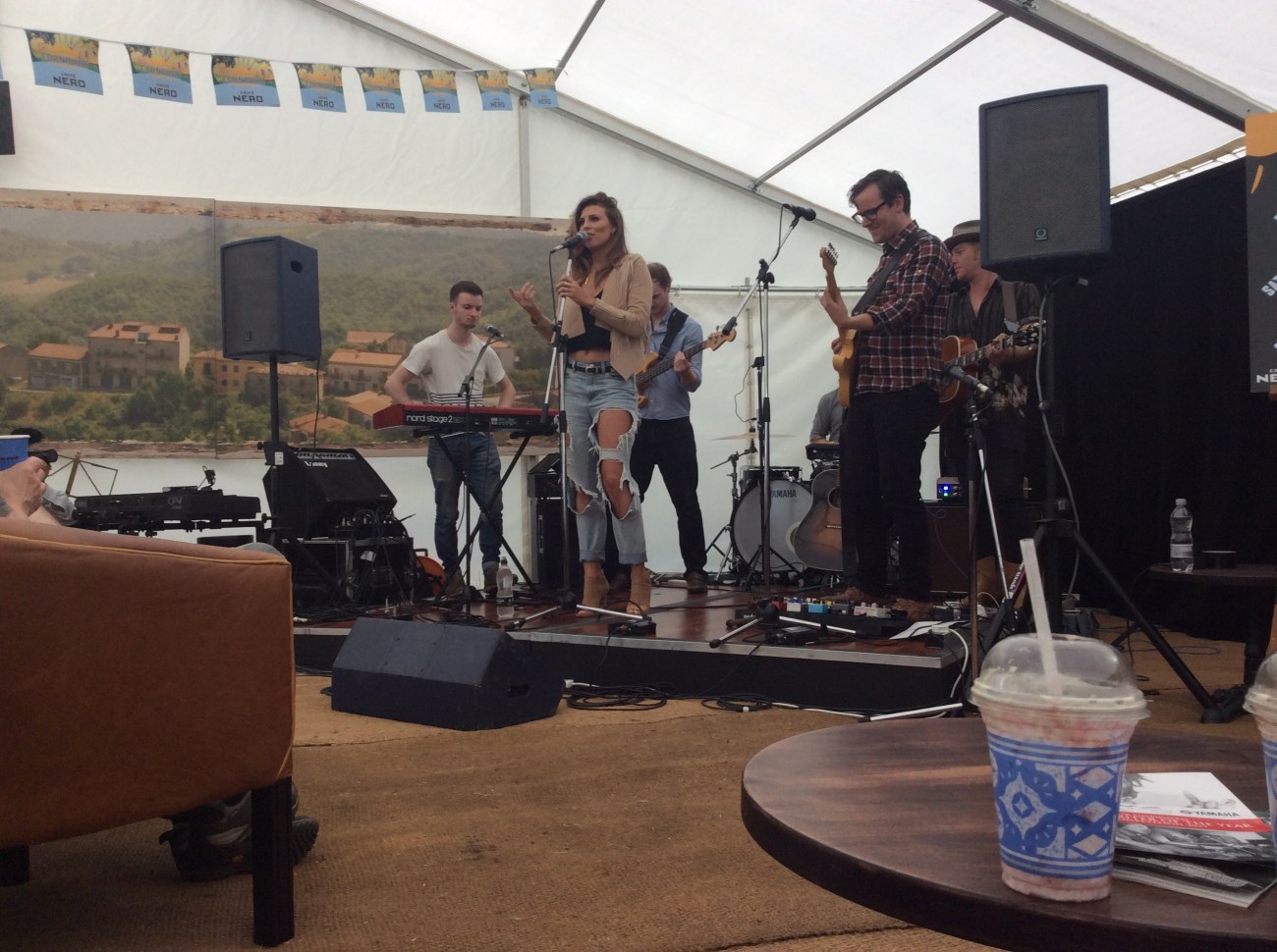 Twinnie performed on the Saturday of Cornbury on the Cafe Nero stage. Set out like a coffee house but in a tent, well Marquee, my friend and I grabbed the front couch. Frappe’s, soft couch, music, we wanted to stay there forever.