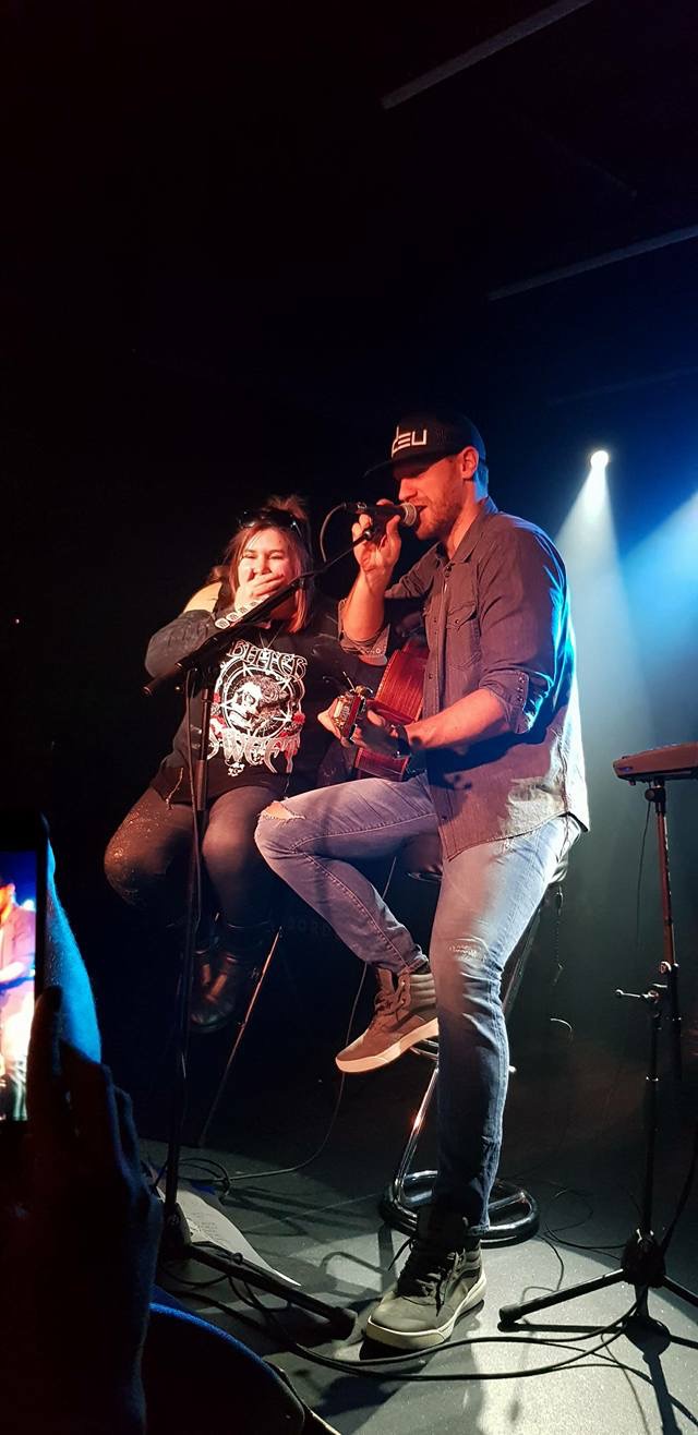 A little while later he was talking to the crowd again and then he looked at me and said “Hey you, I wanna talk to you”. At first I didn’t realise he was addressing me so I looked around to see who he was talking to and then he said “Yeah I’m talking to you, get up here“. Surprised, nervous and equally excited, I got on stage with him. I sat on a stool right next to him (eeek) and he asked me what my name was. I replied “Kayleigh” It took him a few attempts to get it right…. ha-ha! He also told me that I had a crazy laugh ha-ha!
