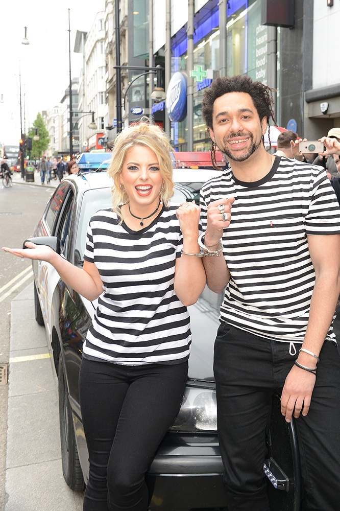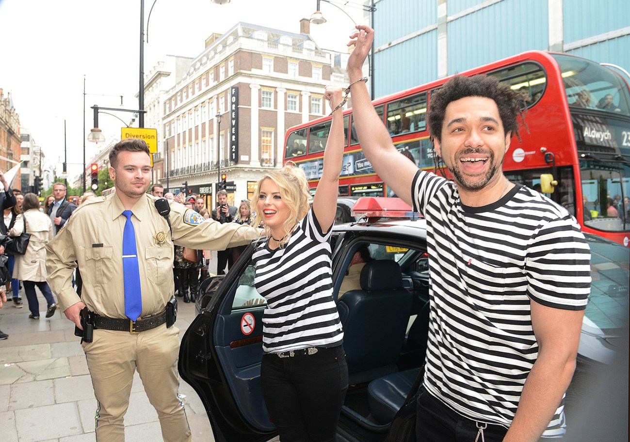 Crissie Rhodes and Ben Earle turned up to HMV Oxford Street handcuffed to one another in black and white convict t-shirts. The Shires were assisted from the vehicle by their chauffeur, an American cop.