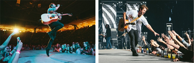 Brandon opens for Old Dominion at Iowa City’s Carver-Hawkeye Arena (left), and interacts with fans at Milwaukee’s Miller Park Stadium while sporting a Brewers jersey (right)