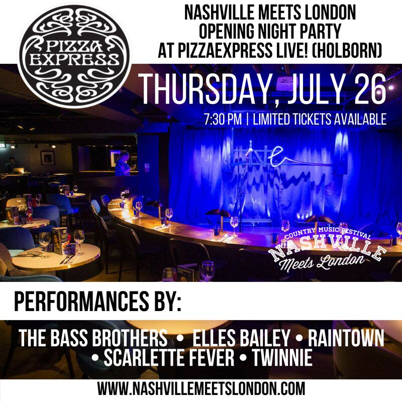 On the heels of the successful Nashville Meets London Presents monthly residency, organizers are excited to announce the addition of a pre-festival Nashville Meets London Opening Night Party at PizzaExpress Live (Holborn), to be held July 26. The music-filled evening will feature an array of short performances paired with the option of dining and interacting with talent and other guests in attendance. This year’s Opening Night Party talent lineup includes The Bass Brothers, Elles Bailey, Raintown, Scarlette Fever, and Twinnie. Tickets are very limited, and available here: https://www.pizzaexpresslive.com/nashville-meets-london