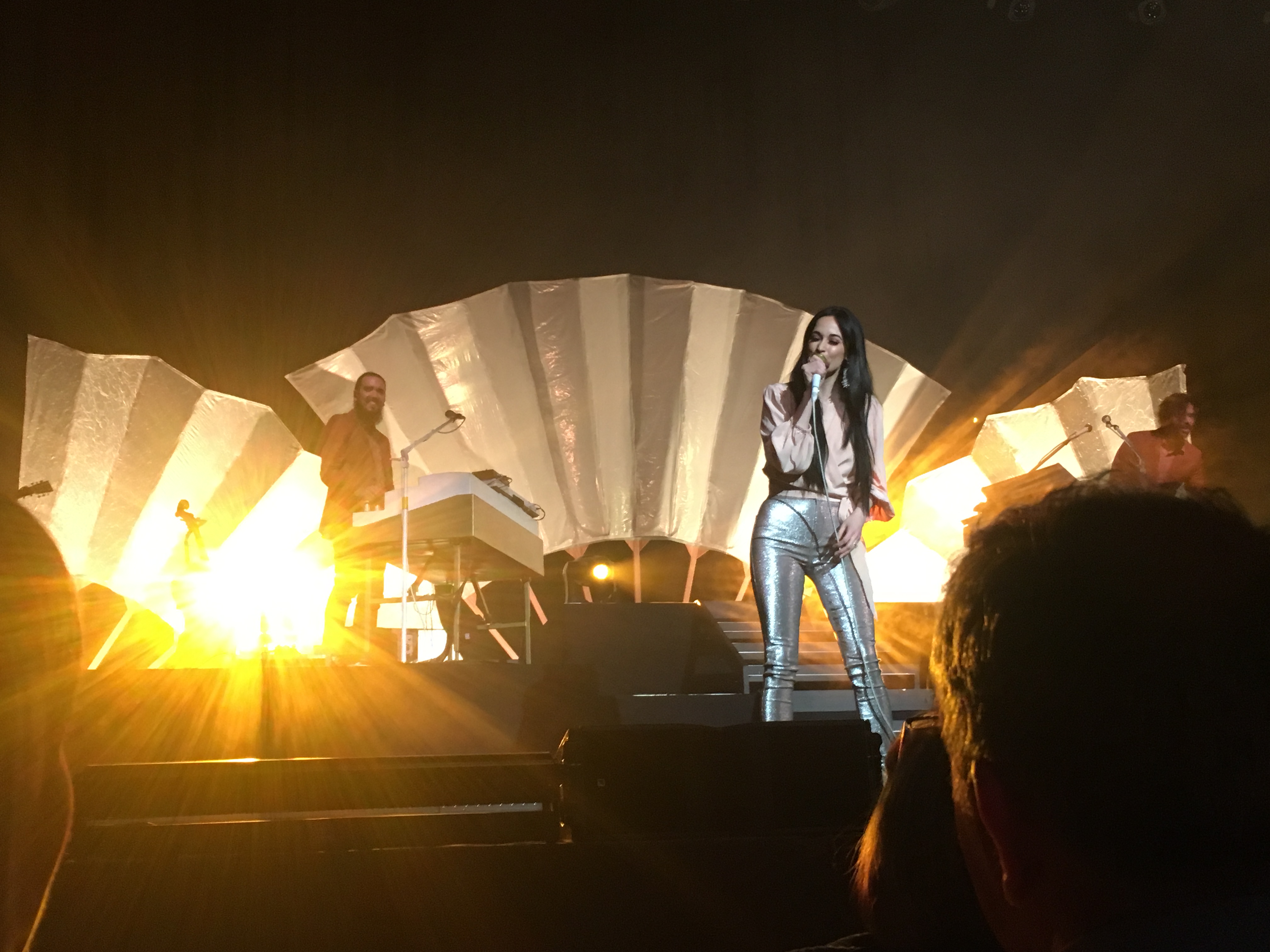 Now I am not sure how much Kacey had to do with it but being given seventh row was a very welcomed surprise. The arena was filled with a very up beat and excitable atmosphere. The lights went dark and the room filled with a sweet strawberry smell which we were convinced was intentional, however, it turned out to be someone’s vapour. (Great idea though Kacey so perhaps some scented shows next tour?).