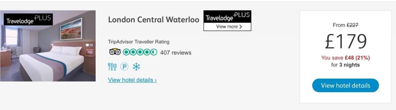 I recently stayed at Travelodge-Waterloo which is about a five minute walk (max) from the train station. As you walk out, cross the road, turn right and you will be there in minutes.