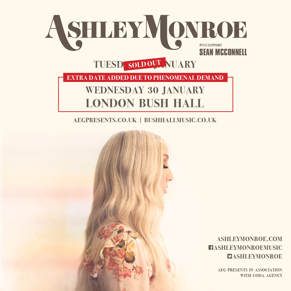 Ashley Monroe’s London show on 29th January sold out within a few days, so a second date has been added the following night; and the Glasgow show has been upgraded due to demand. In addition, support for all shows (except Oslo) will be singer-songwriter Sean McConnell. Full dates below: