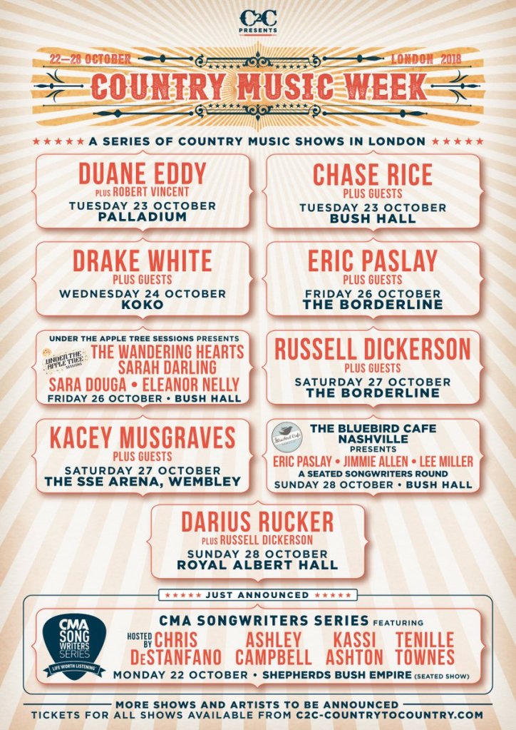 Country Music Week had its second year this year (2018) and it is always a good time. With so many wonderful acts from the UK, US, Canada and beyond, you have shows every night all around London. This year saw intimate shows with Drake White and The Big Fire, Ryan Kinder, Chase Rice, Jimmie Allen, Tenille Townes, Lainey Wilson, Duane Eddy, Sarah Darling, The Wandering Hearts, Cassadee Pope, Eric Paslay and more and big shows from Kacey Musgraves, a Songwriters Series with Chris DeStefano, Kassi Ashton, Tenille Townes, Ashley Campbell and a Royal Albert Hall performance from Darius Rucker. Country Music Week is so special and is something to mark off the diary every year so make sure that week (2019 yet to be announced) in October is booked off work, it is worth it.