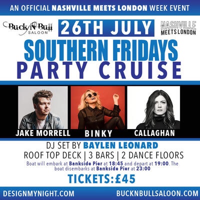 That Friday, Buck’ N Bull Saloon and Nashville Meets London will come together to host a ‘Southern Fridays’ boat cruise down the River Thames. The programme includes acoustic performances by Binky, Callaghan, and Jake Morrell, and a DJ set by Baylen Leonard featuring fan-favorites spanning Country and Americana. More information surrounding the pre-festival cruise is available by visiting www.bucknbullsaloon.com. Tickets for the event can be purchased here. Last year’s event was SOLD OUT and a limited number of tickets are left. The boat will embark at Bankside Pier at 18:45 and depart at 19:00. The boat disembarks at Bankside Pier at 23:00.