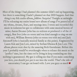 Folklore is so soothing and brings a sense of serenity. You can’t help but be enthralled by the music, the lyrics and the vocals and every detail has been so expertly thought through. I look forward to hearing fellow artists thoughts and if any covers come from it. For example Ruston Kelly’s version and love for All Too Well, Ryan Hurd’s cover of False God and Keith Urban’s cover of Lover and his constant gushing about her songwriting and his love for Cornelia Street.