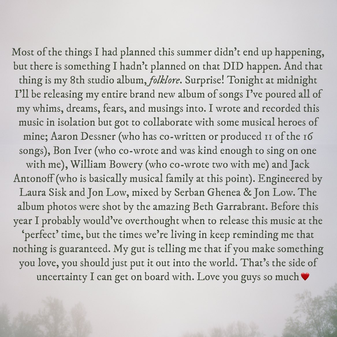Most of us came to love Taylor Swift during her country music days, others via her pop days and fans are fans of both styles but to hear that a Folk styled album with possible Country/Americana roots was to be a surprise release album was something us Swifties have dreamt about for a long time. Despite Debut, Fearless, Speak Now and Red being more country and the latter leaning more towards pop and with 1989, Reputation and Lover being pretty full on pop, Taylor isn’t exactly a stranger to the folk stylings of music as she released the song Safe and Sound with The Civil Wars for the motion picture soundtrack to The Hunger Games. A song that I would argue is one of her best and brings me back to the point that this woman can write pretty much anything.