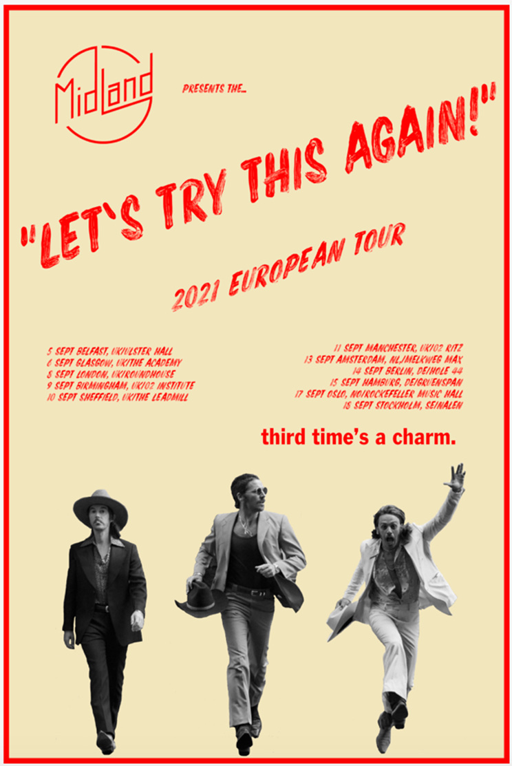 Cameron, Jess and Mark are set to bring their “LET’S TRY THIS AGAIN! 2021 EUROPEAN TOUR” across the Atlantic next September with dates listed below, tickets purchased for the previous shows that were forced to be postponed remained valid with full ticket details on their WEBSITE whilst you can keep up to date with Midland on TWITTER FACEBOOK INSTAGRAM
