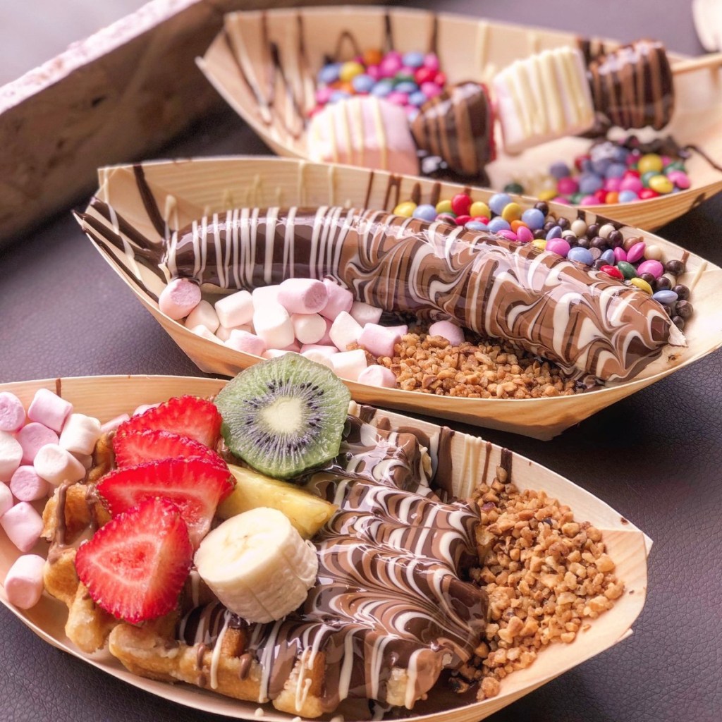The Waffle Float serve hand made Liege Belgian waffles with a wide variety of delicious toppings including Nutella, Banana, Ice Cream, Maple Syrup and more. A very rich desert depending on your toppings.
