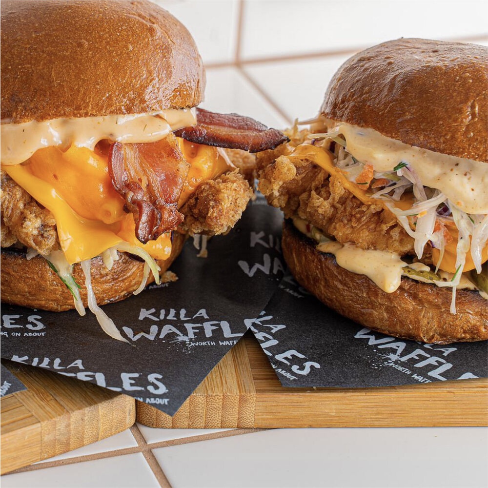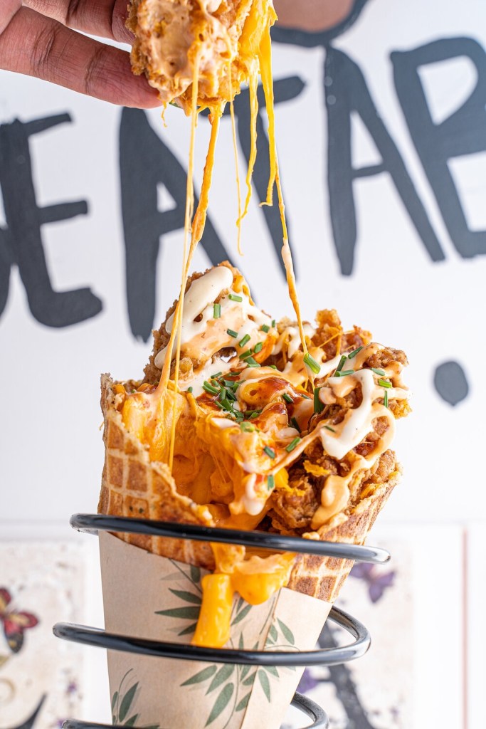 Now Killa Waffles really intrigue me. Their website states that KIlla Waffles make savoury & vegetarian waffle cones as well as waffle burgers, using only organic meat and veg ingredients. From freshly baked waffle cones with chicken strips or mac n cheese, to killa burgers with our signature dipping sauces, everything on Killa Waffles’ menu is an original masterpiece, trialed and developed to fuel your body and soul.