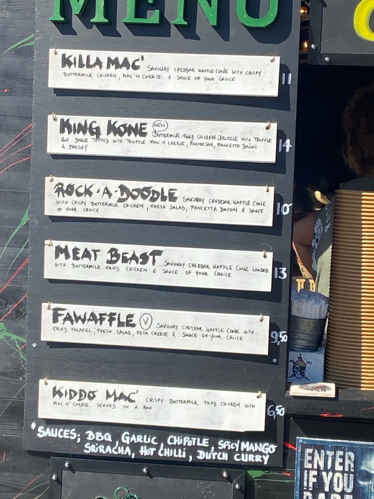 A menu with a great choice we went with the Rock-A-Doodle (Savoury Cheddar Waffle Cone with Buttermilk Fries Chicken, Fresh Salad, Pancetta Bacon and Sauce of your choice)