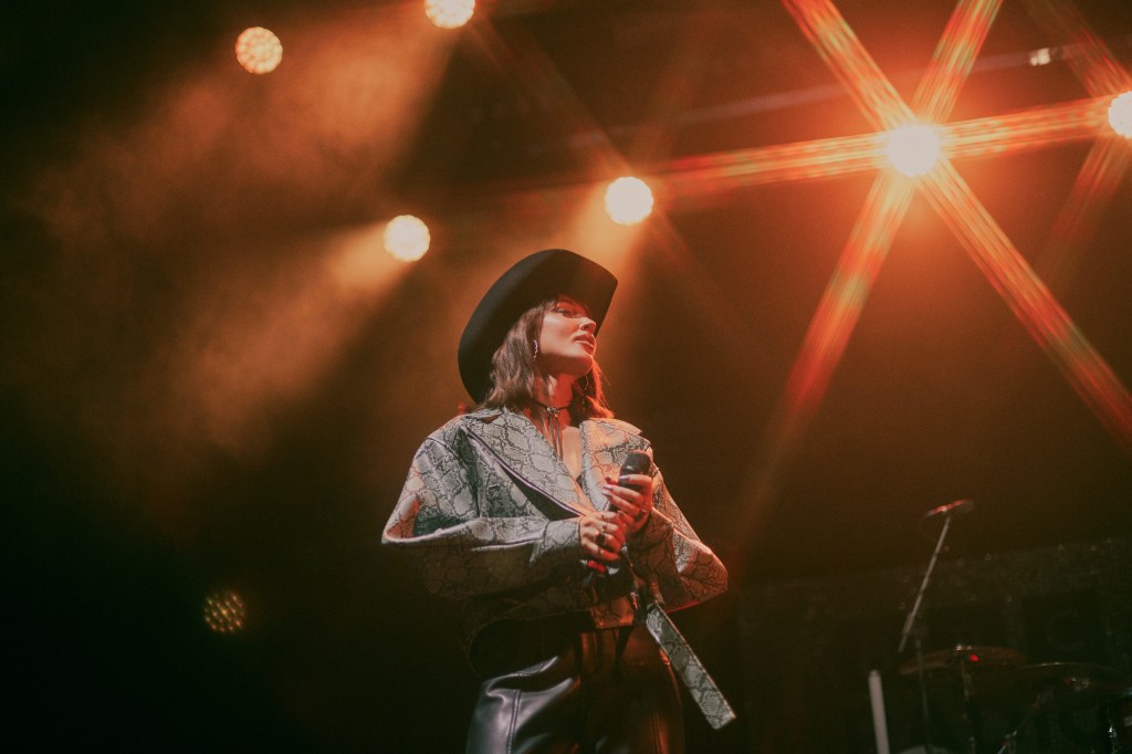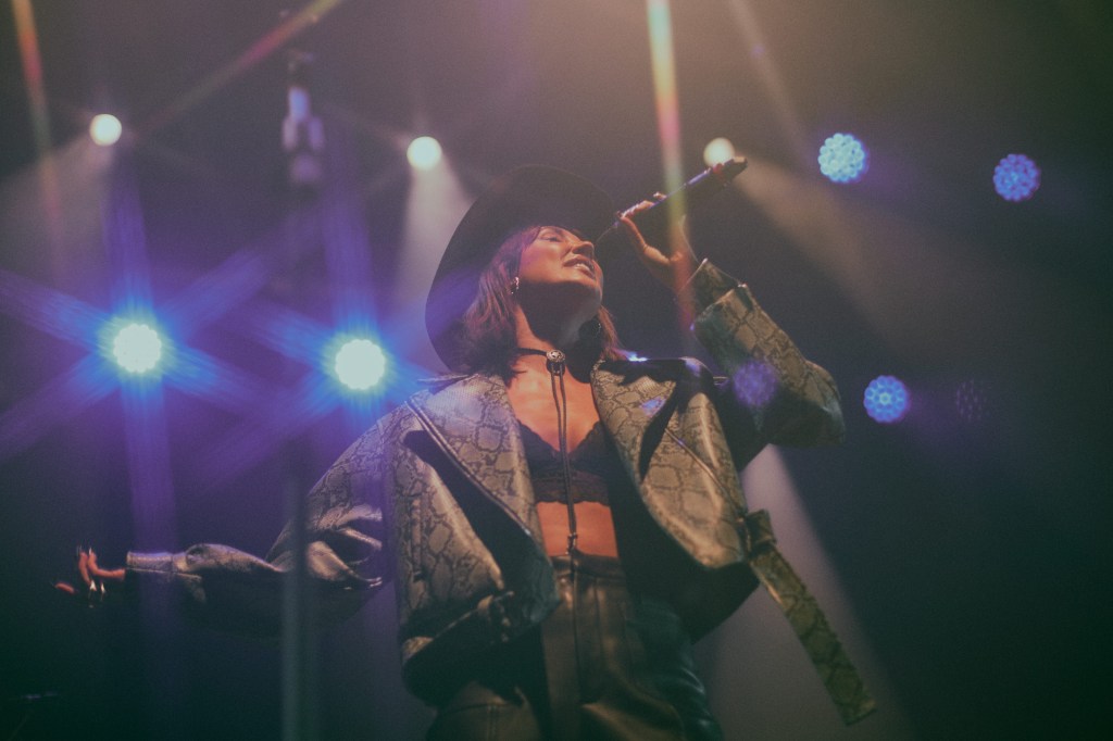 The band took to the stage with Megan following shortly after. Skipping on stage and beaming – sporting a fine lookin’ stetson, leather trousers, a crop top and a pretty cool snake skin inspired jacket, Megan was ready to deliver!