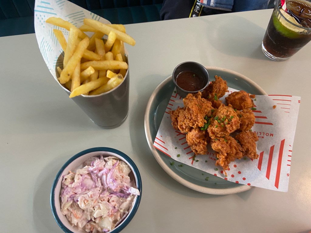 Whilst the burgers looked delicious and undoubtedly would have been delicious, it was fried chicken that caught the eye and my husband had a selection of small plates. The children had a small plate of popcorn chicken and side plates of fries and macaroni cheese.