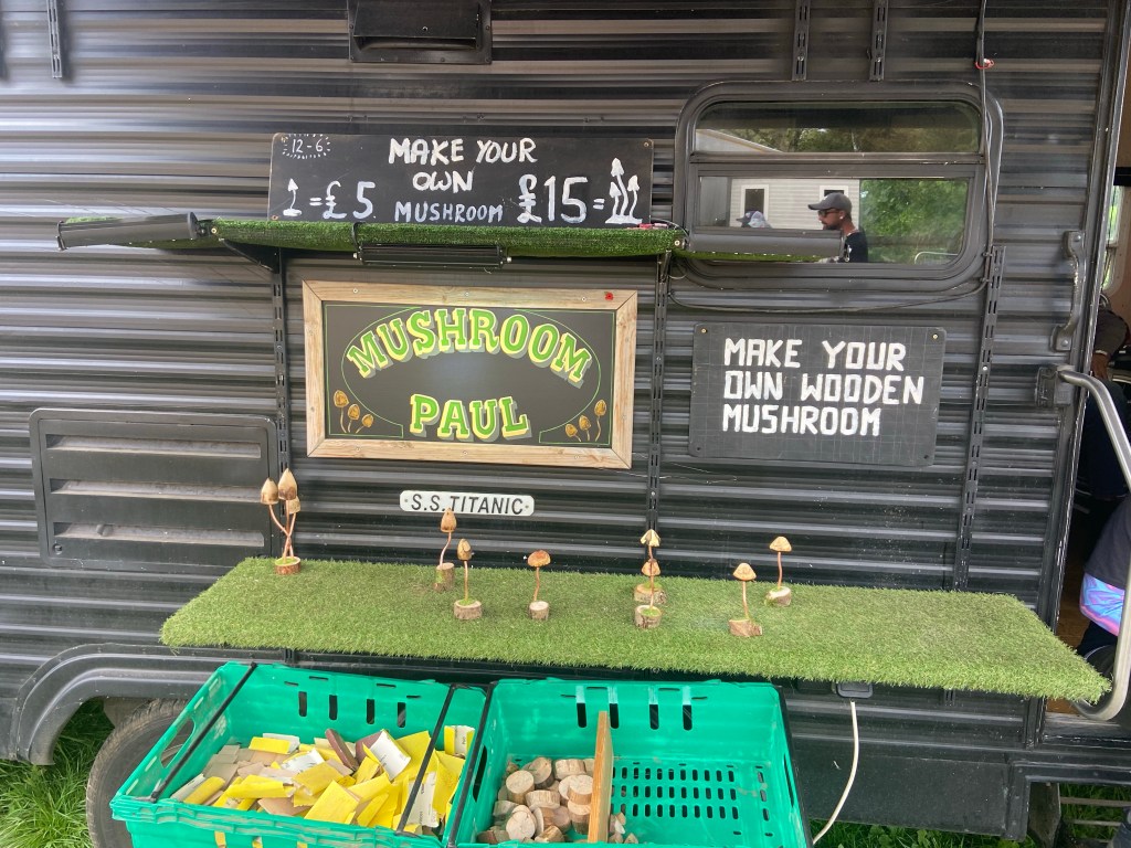 Next up, we decided to all do some mushrooms. What a beautiful thing to do with two small children. Wait a minute…. I mean make wooden mushrooms at the Mushroom Craft Van. This was a really sweet activity that caught our eye on Saturday so we had to go back and do it. A very reasonable cost of £5 each. We sandpapered our Mushroom Heads into shape and then gave them to the staff to blowtorch it slightly to give it a more darker look and then he attached it onto a copper stalk and wooden base.