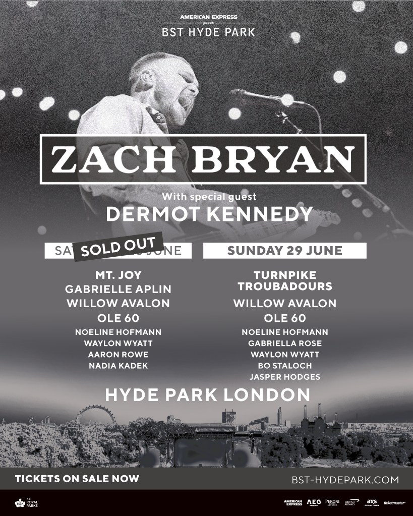 American Express presents BST Hyde Park are delighted to announce the full line-up of guest acts for acclaimed singer-songwriter Zach Bryan’s headliner shows this summer. Remaining tickets are available at http://www.bst-hydepark.com.