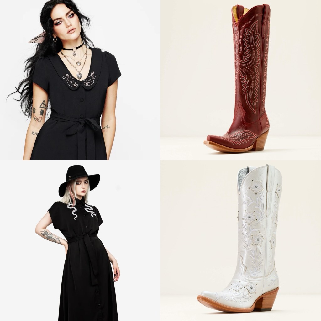 We’re big fans of the clothing brand Disturbia and often wear their dresses and skirts. So we thought—why not share what we love with our readers and how we blend their goth, metal, and grunge-inspired pieces with some country flair? For this, we chose Ariat boots who are a leading brand.
